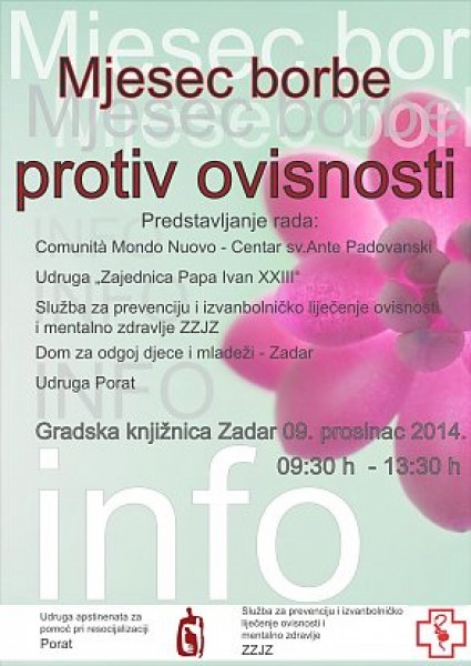 Program će se održavati od 9:30 do 13:30 sati u Gradskoj knjižnici Zadar gdje će se na info štandovima predstaviti različite organizacije koje imaju jedan zajednički cilj - borbu protiv ovisnosti: